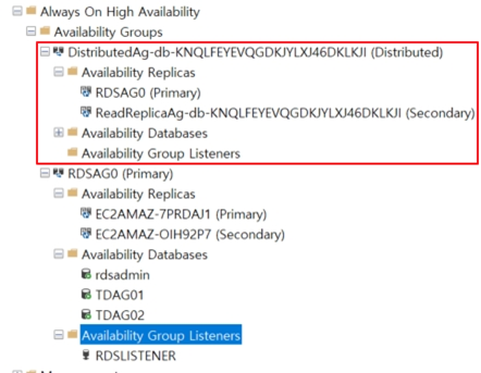 SSMS 에서 확인해보니 읽기전용은 분산된 가용성그룹으로 생성이 된 것을 확인할 수 있다.