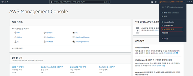 1. 로그인화면에서 우측상단의 드롭박스에서 ‘내 보안 자격 증명’을 선택한다.