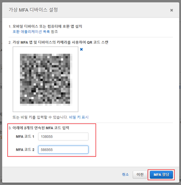 6. 모바일 어플리케이션에서 확인 할 수 있는 MFA코드를 연속으로 2개 입력하고 MFA를 할당한다.(MFA코드는 수초의 시간이 지나면 코드가 변경됨)
