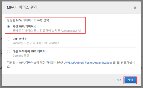 3. MFA 디바이스 관리 창이 팝업되고, 가상MFA 디바이스를 선택한 후, 계속 진행한다.