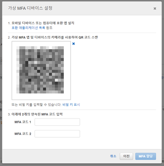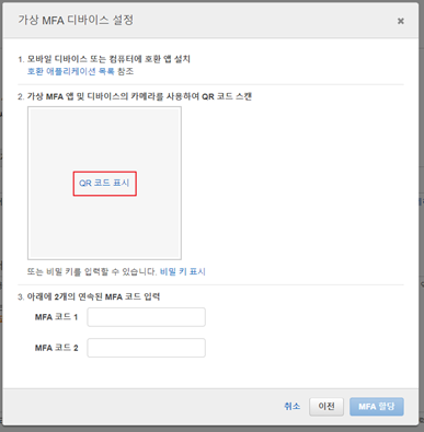 4. 가상 MFA 디바이스 설정 창에서 QR코드표시를 선택한다. 모바일의 앱스토어를 통해 호환 애플리케이션(ex. 구글OTP)을 준비한 후 진행한다.