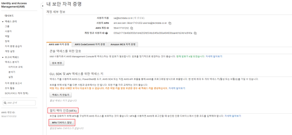 2. IAM service로 연동되면서 자격증명 TAB에서 ‘멀티팩터인증(MFA)’부분에서 MFA디바이스 할당을 선택한다.