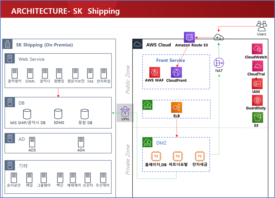 아래의 AWS 아키텍처는 SK해운에서 운영하는 Hybrid 운영방안을 보여줍니다.