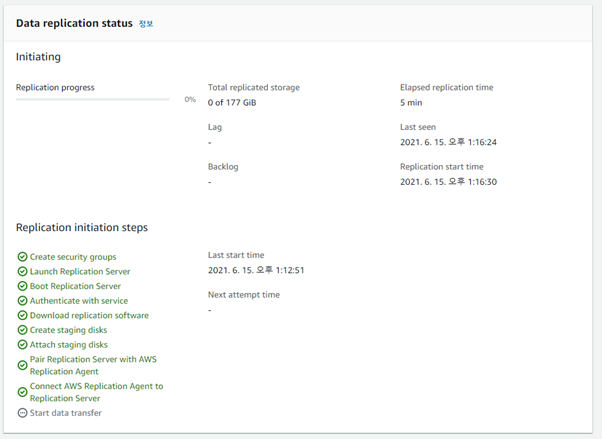 콘솔에서 Source Servers 메뉴를 보면 해당 서버가 보이고 자동으로 복제를 시작합니다.