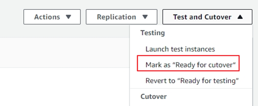정상적으로 복제가 된 것을 확인 후 “Mark as “Ready for cutover”를 클릭하여 준비 상태로 변경합니다.