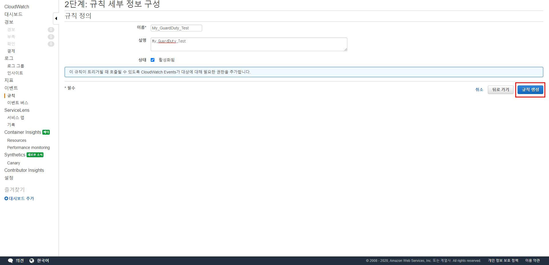 - GuardDuty의 이벤트를 SNS 주제의 Trigger로 설정하는 CloudWatch 규칙을 생성합니다.