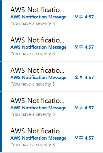 이벤트 소스에서 총 5개의 위험요소를 설정했기 때문에, 5통의 메일이 알람으로 전송됨.